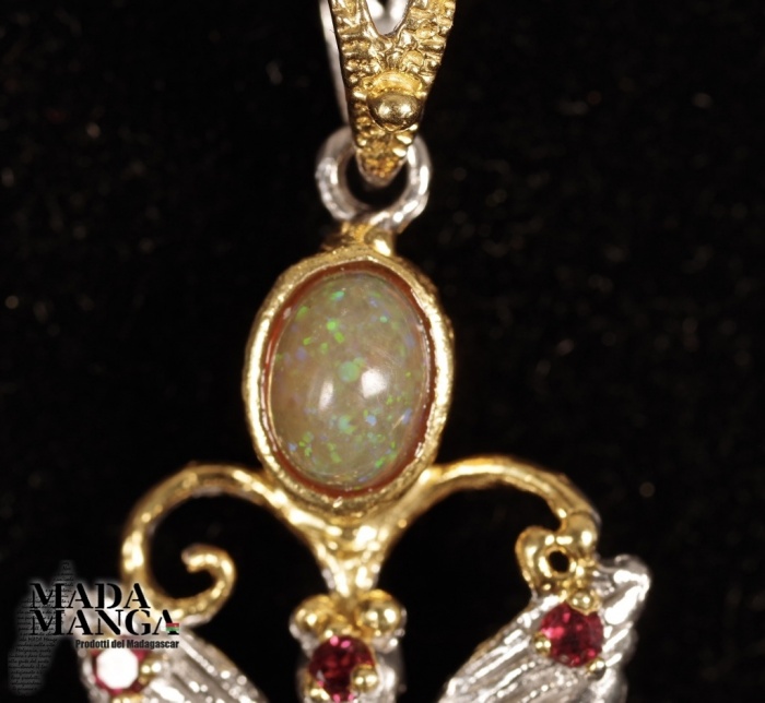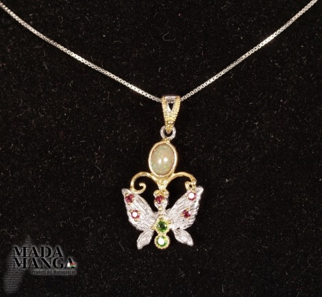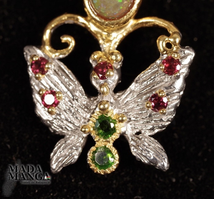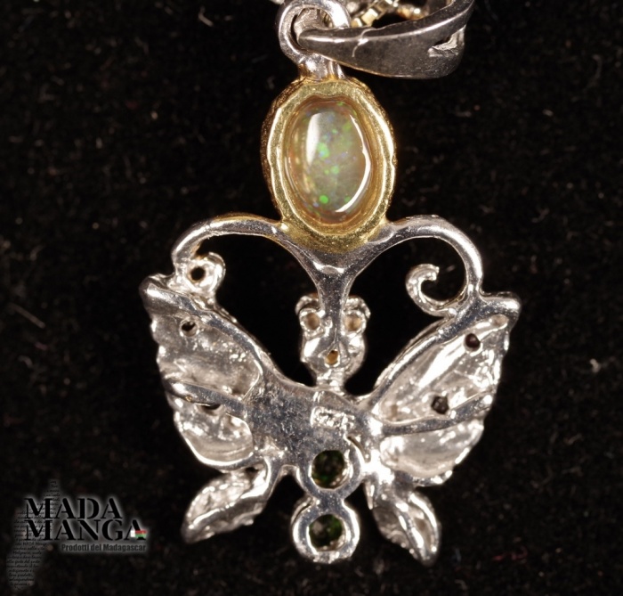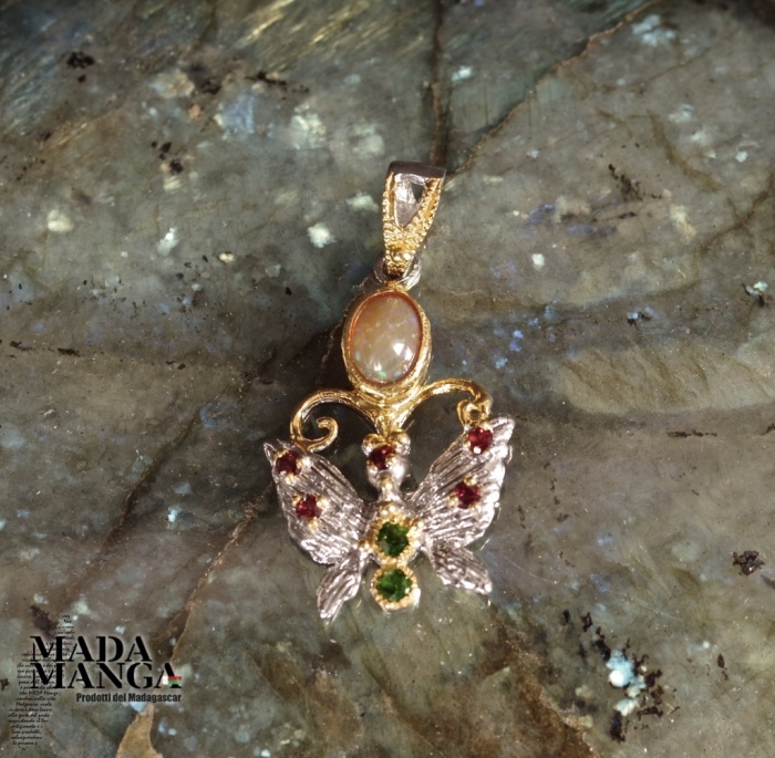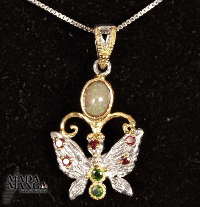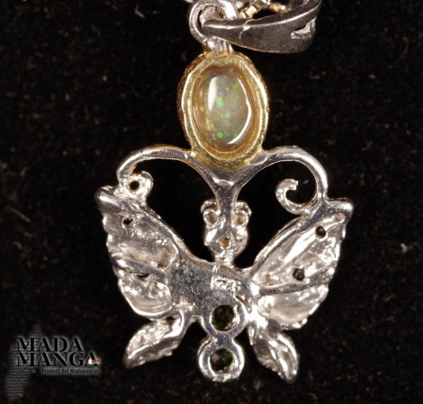 Ciondolo a forma di farfalla in Argento 925 e placcato oro giallo con Opale etiope con piccoli rodoliti e diopsidi sulla farfalla.