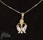 Ciondolo a forma di farfalla in Argento 925 e placcato oro giallo con Opale etiope con piccoli rodoliti e diopsidi sulla farfalla. dimensioni cm.1,8x3,4H con gancio. Peso 3,4 grammi. Venduto con scatolina regalo. La catenina in argento nelle fotografie non è inclusa nel prezzo, si può acquistare cercando codice BJ545