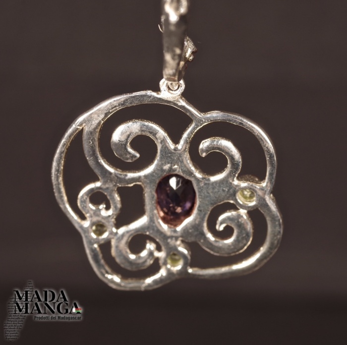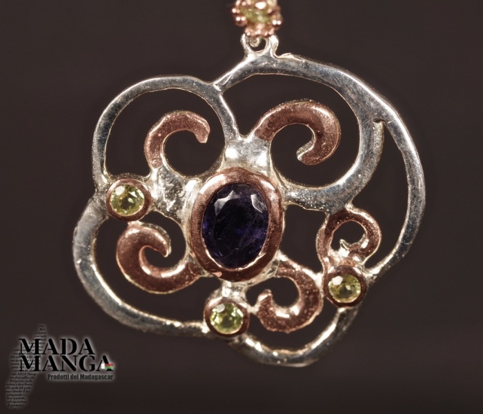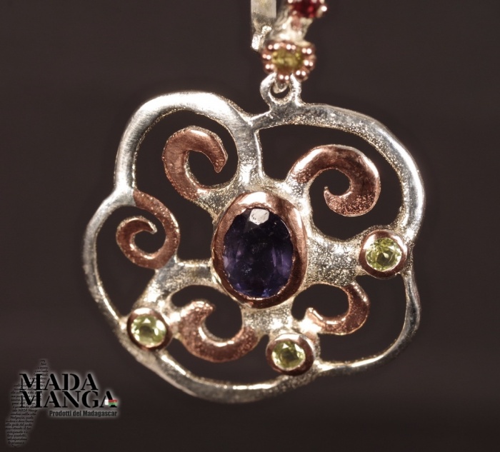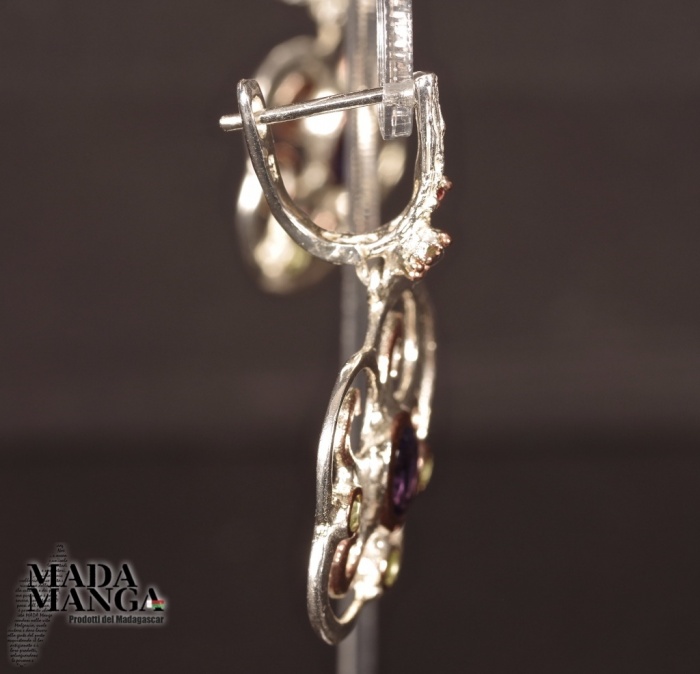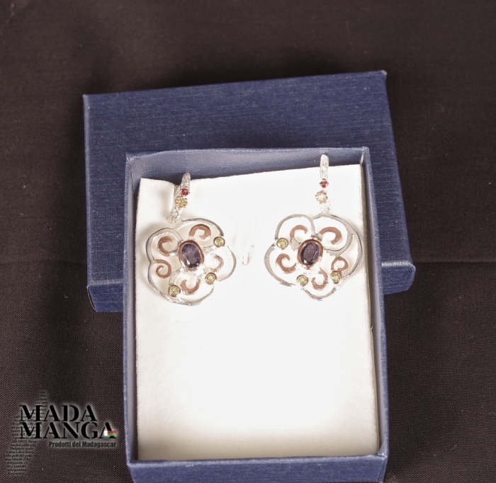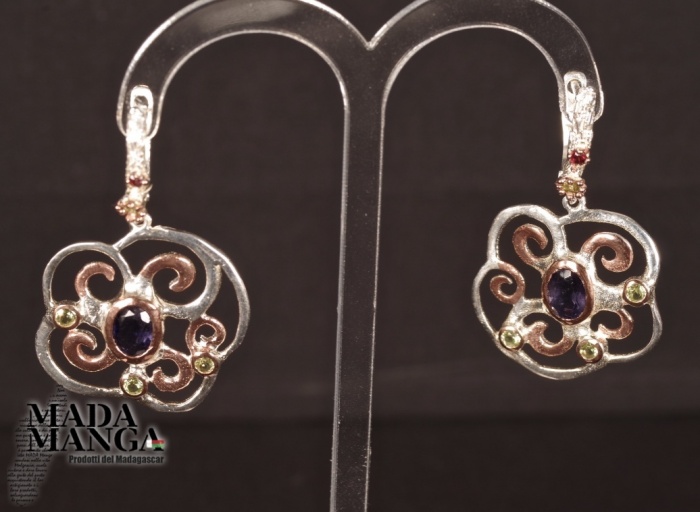 Orecchini in Argento 925 placcati oro rosa, con Ioliti, peridoti e granati sul gancio, dimensioni mm.24x38H gancio compreso. Peso complessivo 9,1 grammi. Venduti con scatolina regalo. Gli orecchini sono realizzati in pezzo unico per modello.