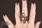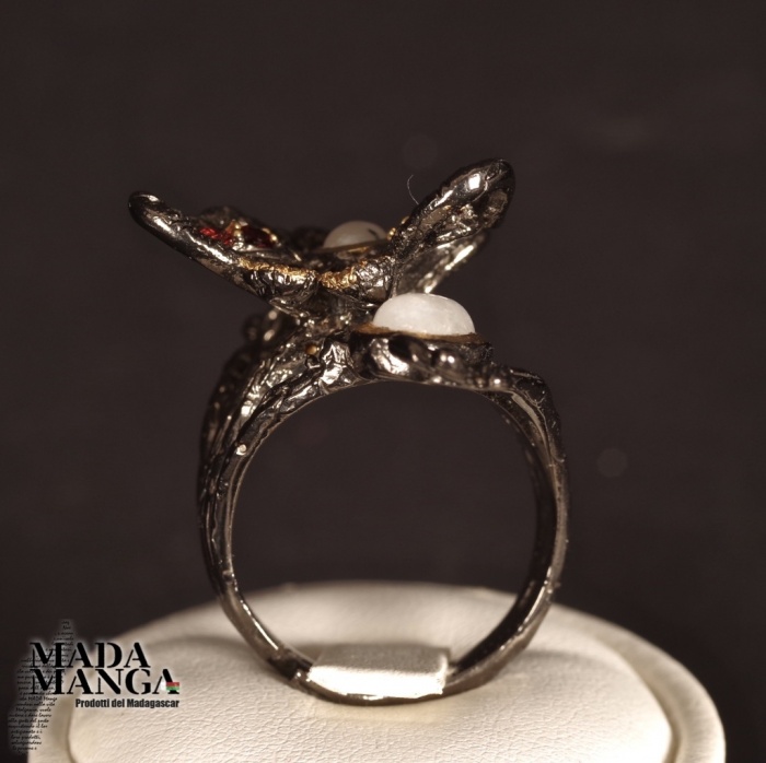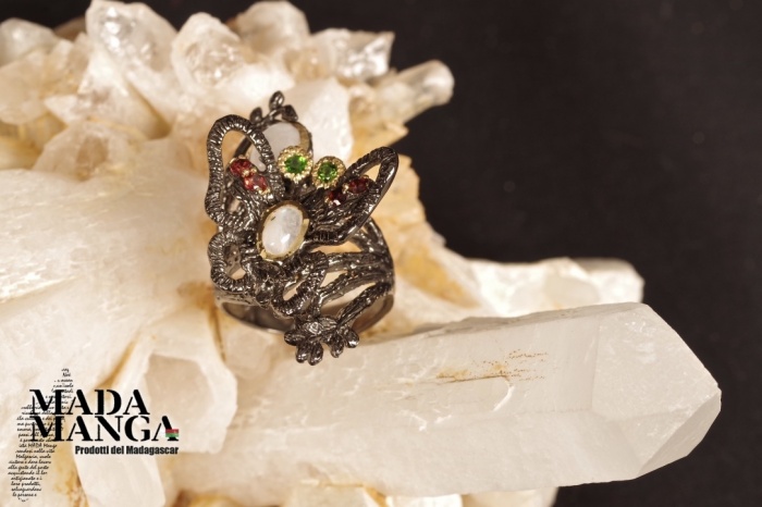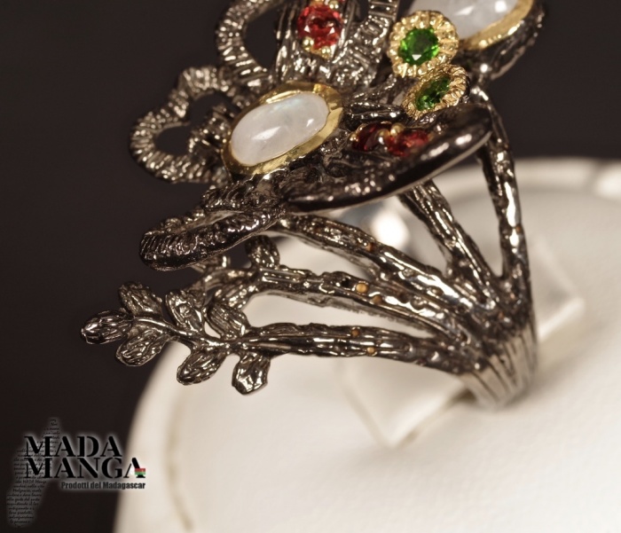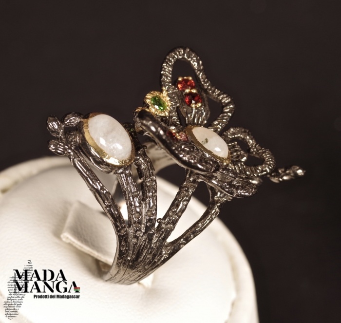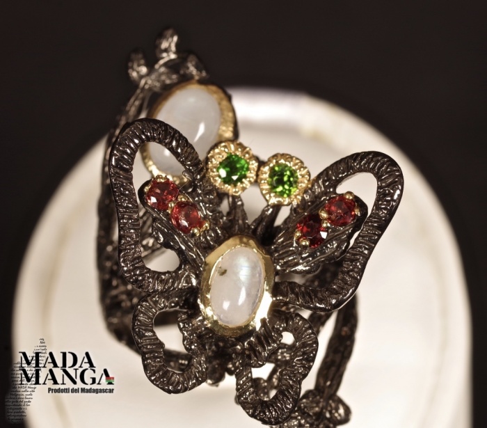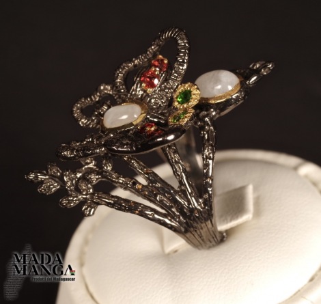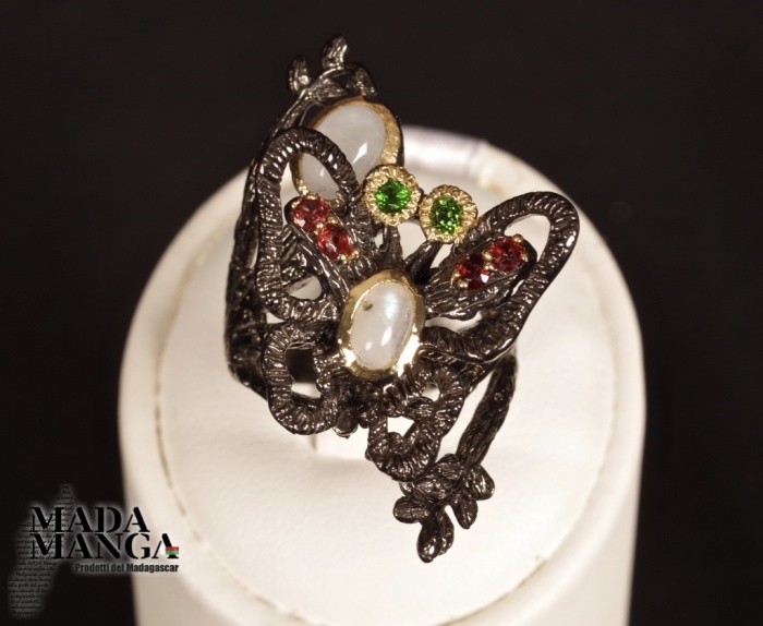Anello con farfalla in Argento 925, rodiato con rodio nero e placcato oro giallo, con due Pietre di Luna, diopsidi e rodoliti.