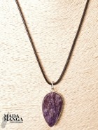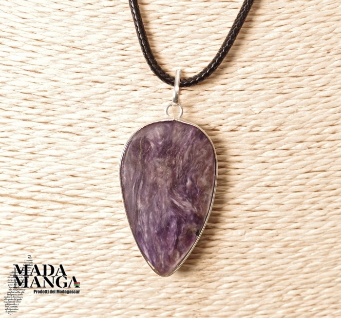 Ciondolo in Charoite (provenienza Russia), dimensioni cm.2,3x4H. Venduto con laccetto in corda cerata. Peso 8,5 grammi. La confezione regalo consiste in sacchetto in tulle e scatolina in carta antemoro.