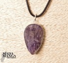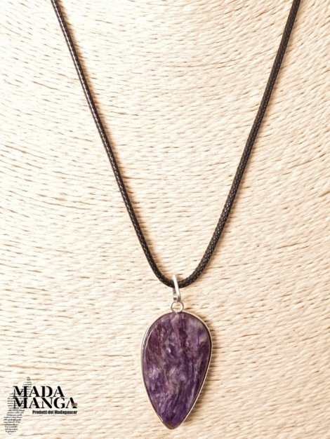 Ciondolo in Charoite (provenienza Russia), dimensioni cm.2,3x4H. Venduto con laccetto in corda cerata.