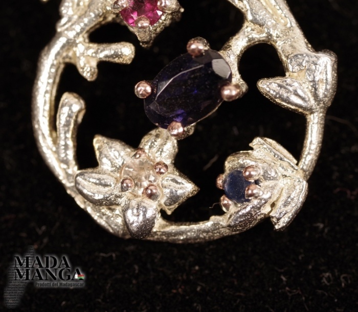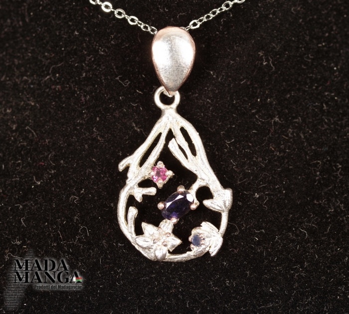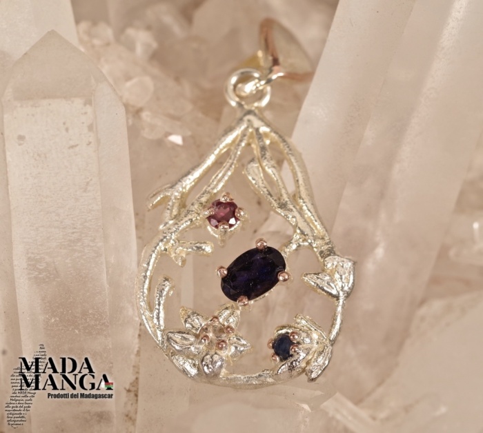 Ciondolo in Argento 925 placcato oro rosa, con Iolite, rodolite (granata ) e piccolo zaffiro.