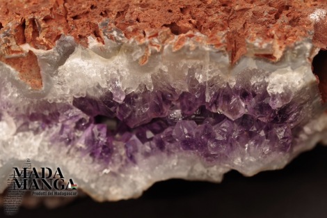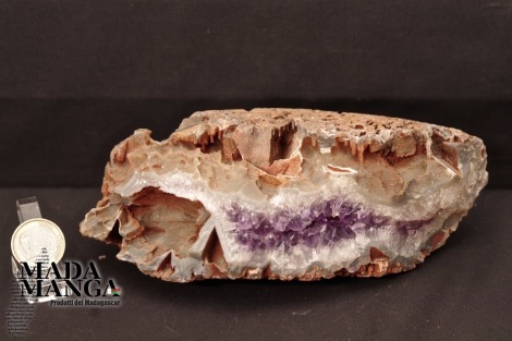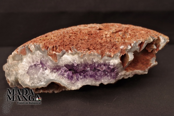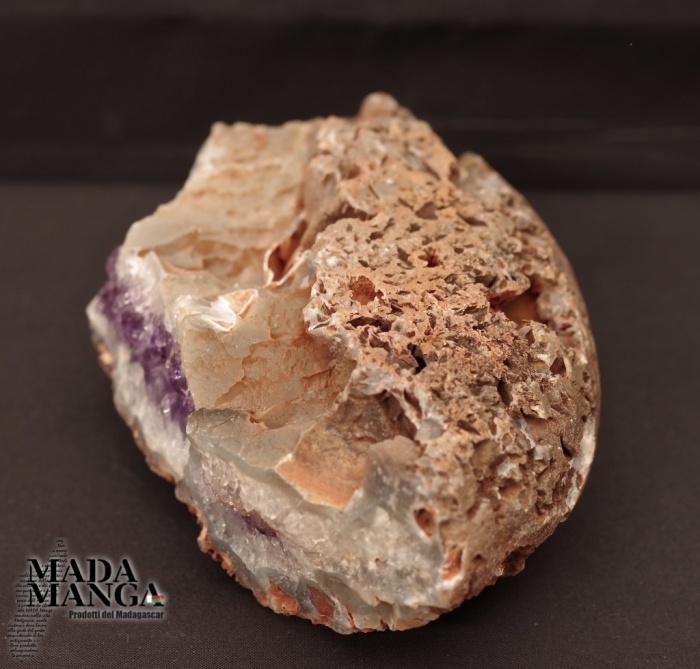Geode di Ametista con cristalli colore viola intenso e con agata tra i cristalli e la matrice, provenienza Madagascar, dimensioni cm.10dx10,5x6,5H, peso 1245 grammi.