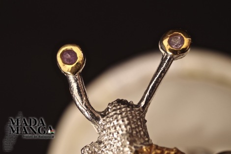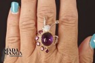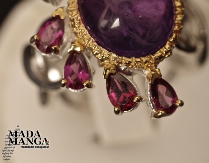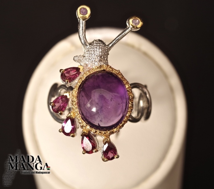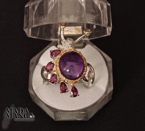 Anello in Argento 925 a forma di lumaca con placcature in oro giallo, con ametista da mm.10x12 e rodoliti, Misura americana 7,75 misura italiana 17, diametro interno mm.17,97. peso anello 9,8 grammi. Venduto con scatolina regalo. L'anello è realizzato artigianalmente in pezzo unico per modello e misura.