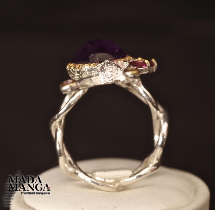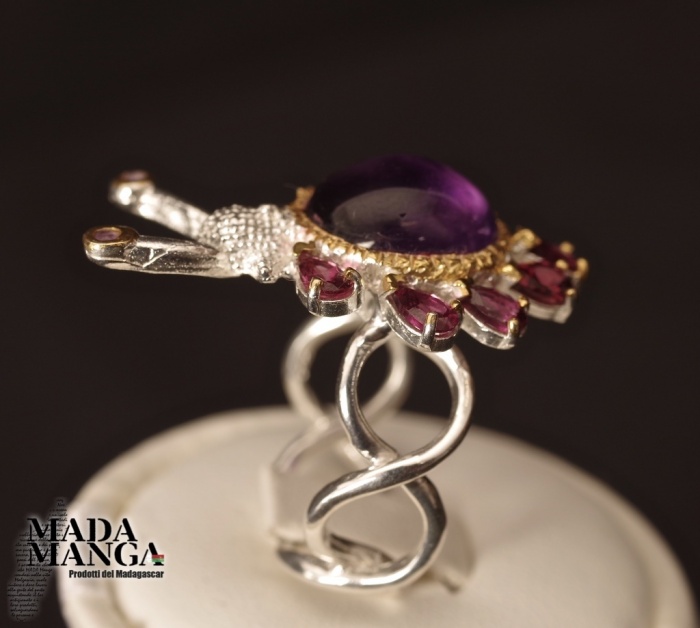 Anello in Argento 925 a forma di lumaca con placcature in oro giallo, con ametista da mm.10x12 e rodoliti,