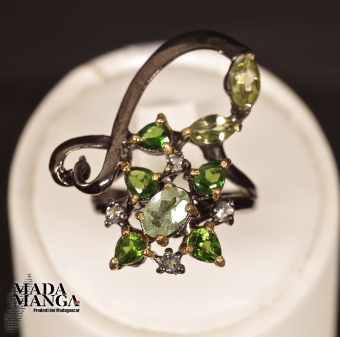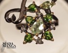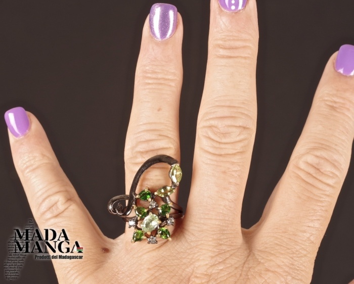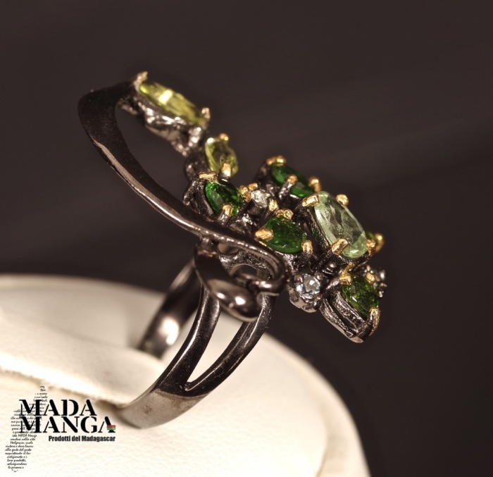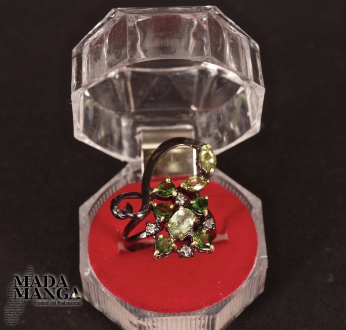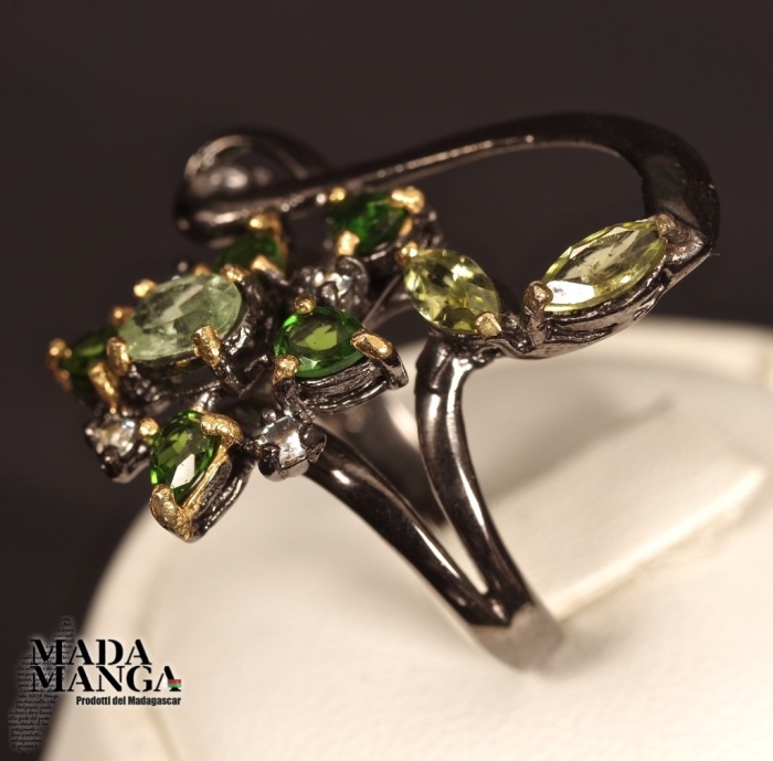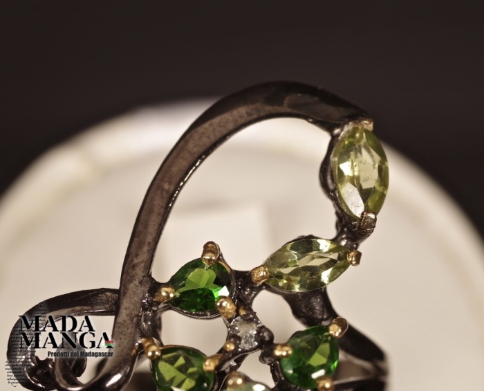 Anello in Argento 925 rodiato con rodio nero e con placcature in oro giallo, con Tzavorite da mm.6x4 e con peridoti e cromo diopsidi.