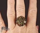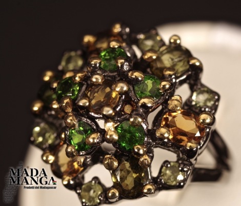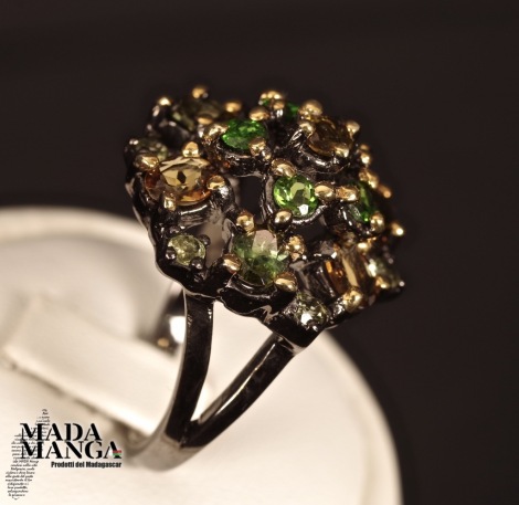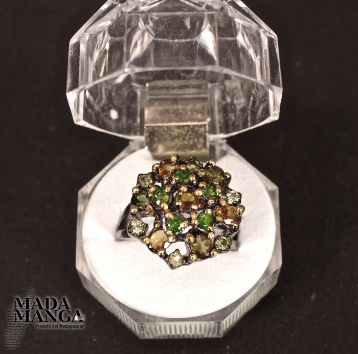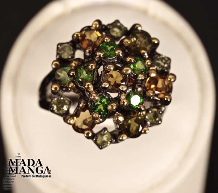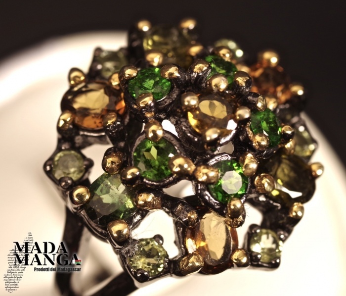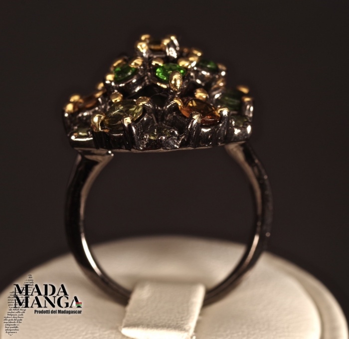 Anello in Argento 925, rodiato con rodio nero con placcature in oro giallo, con Tormaline, Cromo diopsidi e peridoti.