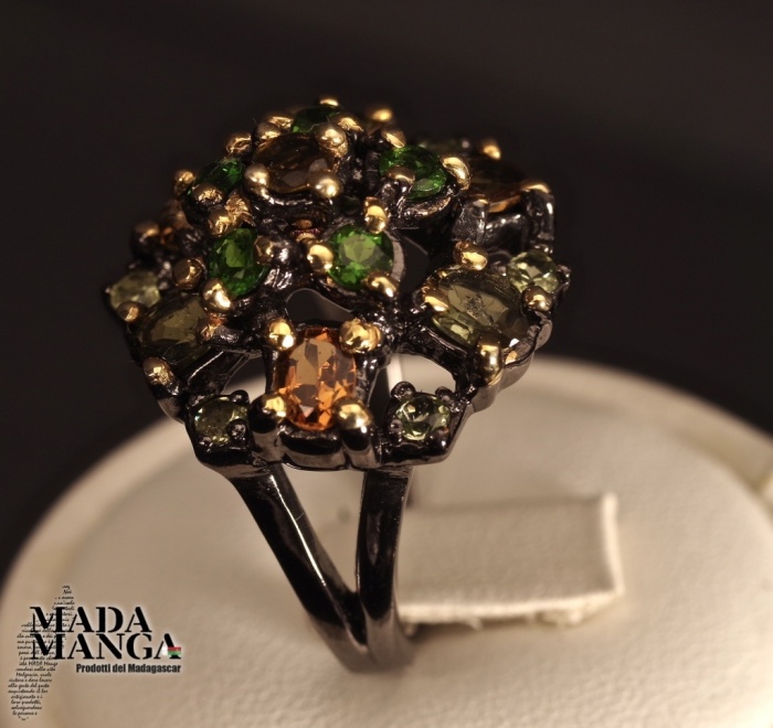 Anello in Argento 925, rodiato con rodio nero con placcature in oro giallo, con Tormaline, Cromo diopsidi e peridoti. peso anello 9,7 grammi. Misura americana 8,75 misura italiana 19, diametro interno mm.18,71. Venduto con scatolina regalo. L'anello è realizzato artigianalmente in pezzo unico per modello e misura.