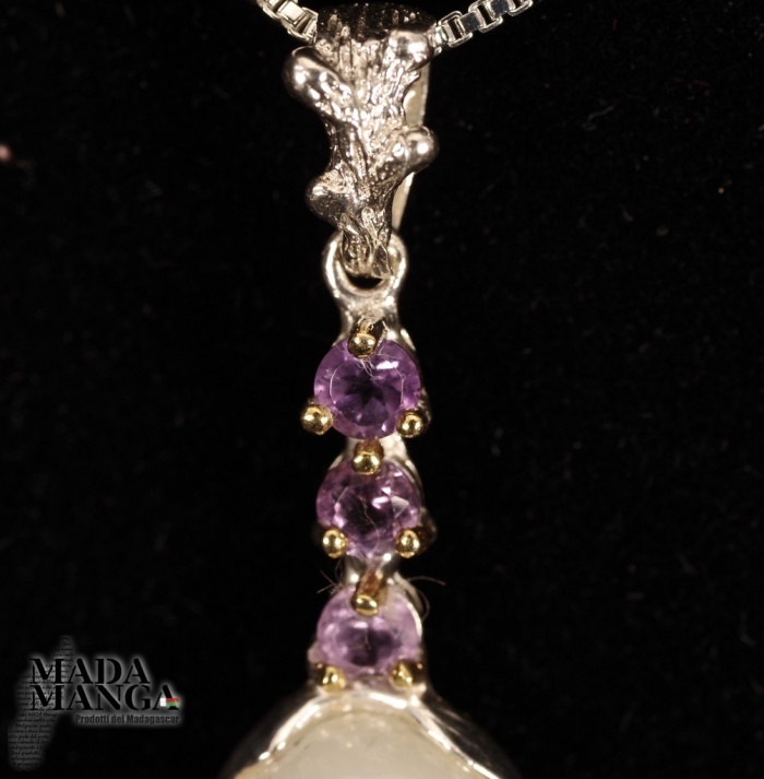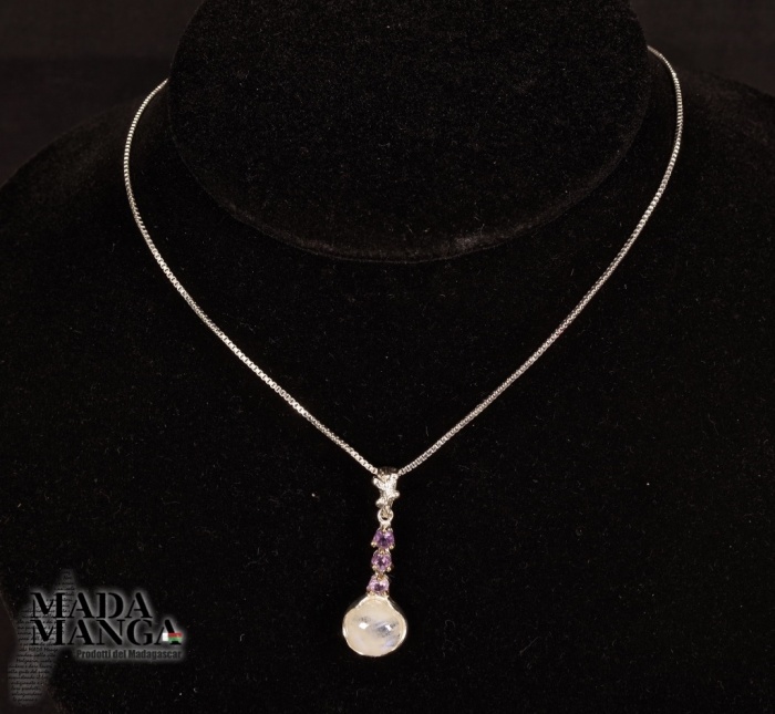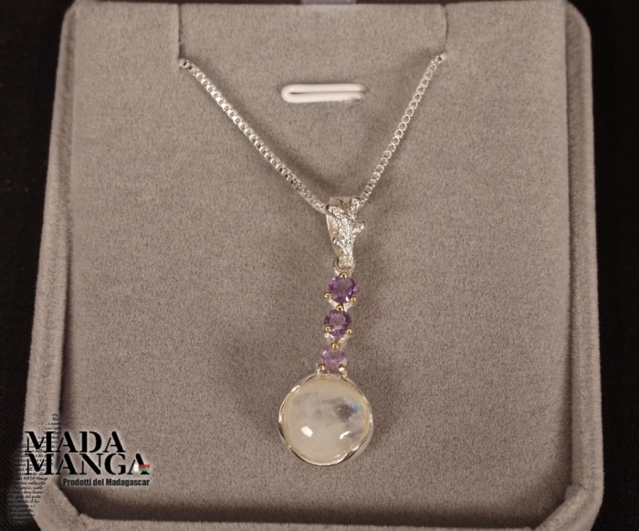 Collana in Argento 925 con ciondolo con pietra di luna diametro mm.20 e tre ametiste, dimensione ciondolo cm.1,2x3,4H gancio incluso.