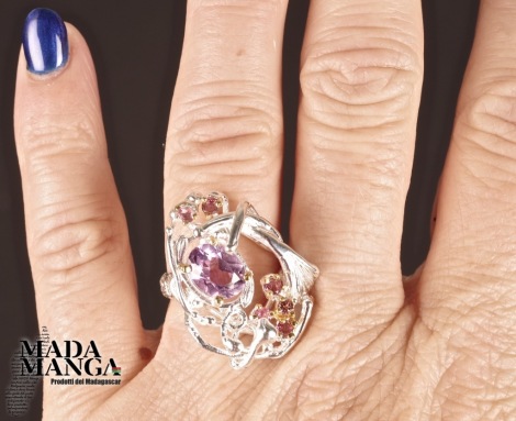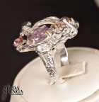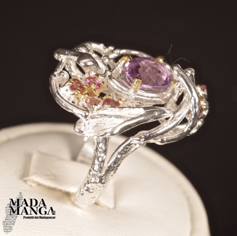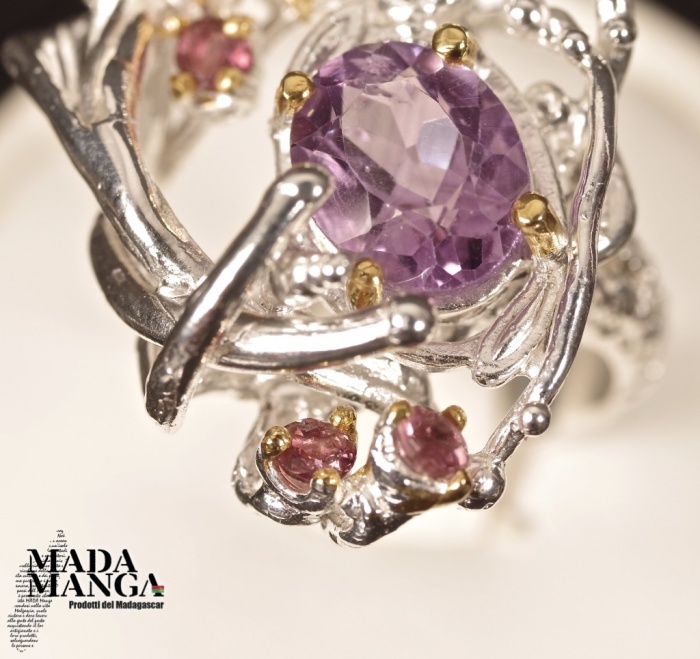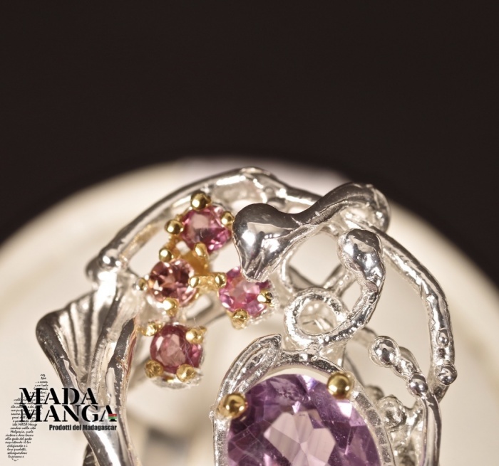 Anello in Argento 925 con placcature in oro giallo, con Ametista da mm.7x9 e piccole tormaline rosa, peso anello 8,7 grammi. Misura americana 6,75, misura italiana 14, diametro interno mm.17,12. Venduto con scatolina regalo. L'anello è realizzato artigianalmente in pezzo unico per modello e misura.