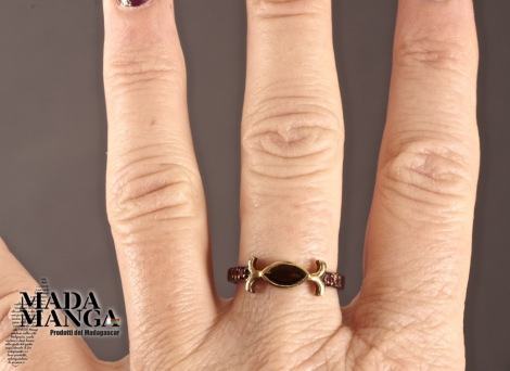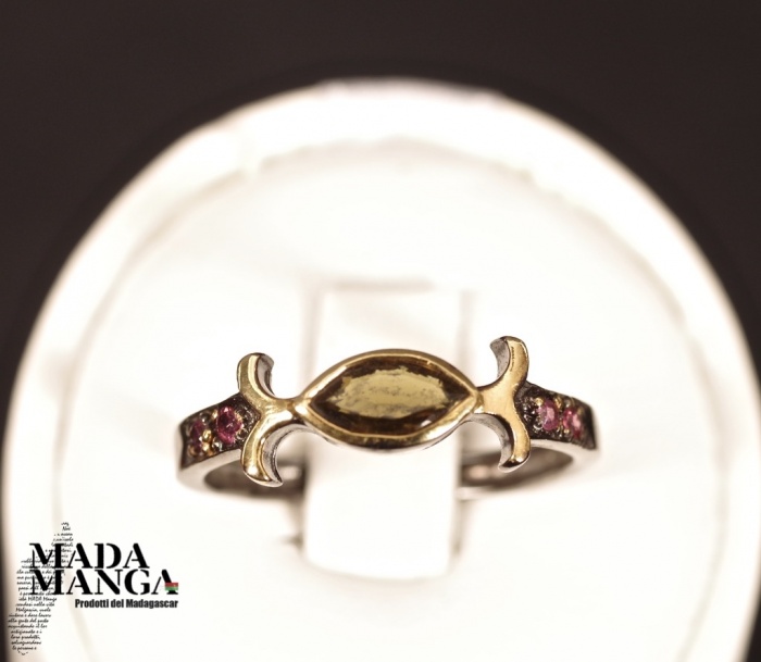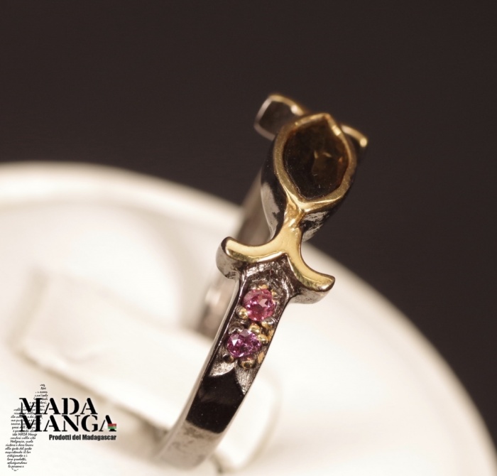 Anello in Argento 925 rodiato con rodio nero, placcature in oro giallo con tormalina verde da mm.7x4 e piccole rodoliti. Misura americana 8, misura italiana 17, diametro interno mm.18,19, peso anello 2,2 grammi. Venduto con scatolina regalo. L'anello è realizzato artigianalmente in pezzo unico per modello e misura.