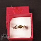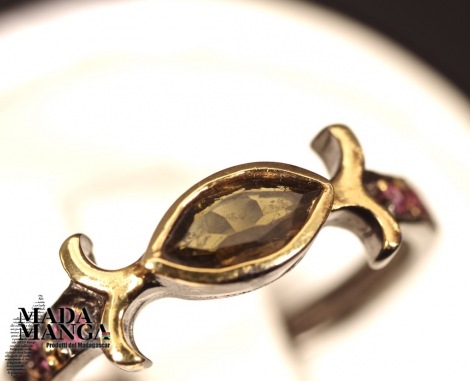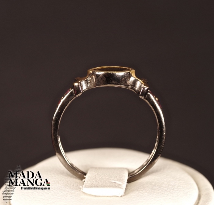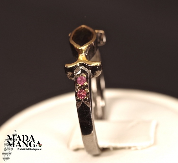 Anello in Argento 925 rodiato con rodio nero, placcature in oro giallo con tormalina verde da mm.7x4 e piccole rodoliti.