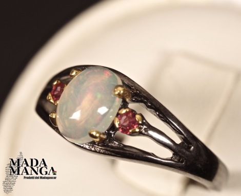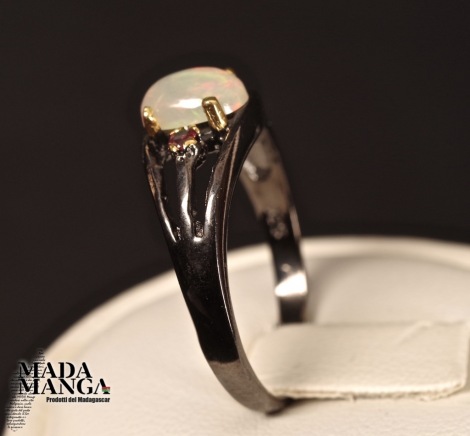 Anello in Argento 925 rodiato con rodio nero e con placcature in oro giallo, con opale etiope mm.5x7 e piccoli granati.