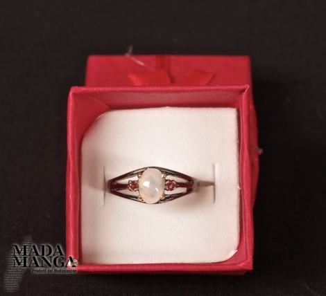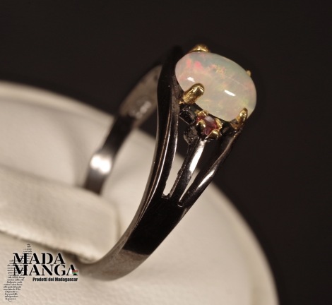 Anello in Argento 925 rodiato con rodio nero e con placcature in oro giallo, con opale etiope mm.5x7 e piccoli granati. Misura americana 6,5, misura italiana 13, diametro interno mm.16,92, peso 2,1 grammi. Venduto con scatolina regalo. L'anello è realizzato artigianalmente in pezzo unico per modello e misura.