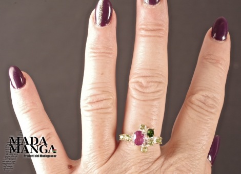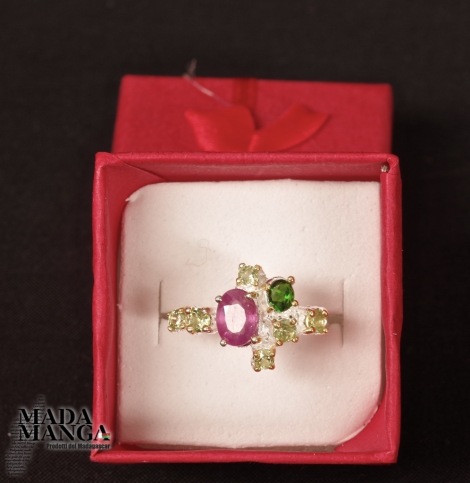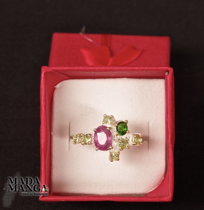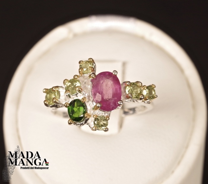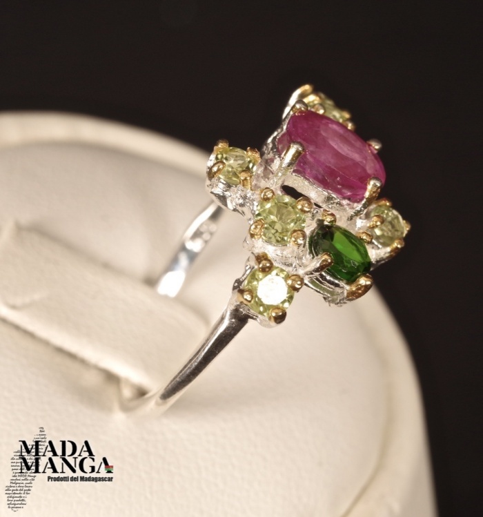 Anello in Argento 925 con placcature in oro giallo, con rubino da mm.5x7, cromo diopside e piccoli peridoti. Misura americana 7,25, misura italiana 15, diametro interno mm.17,55, peso 3,1 grammi. Venduto con scatolina regalo. L'anello è realizzato artigianalmente in pezzo unico per modello e misura.
