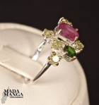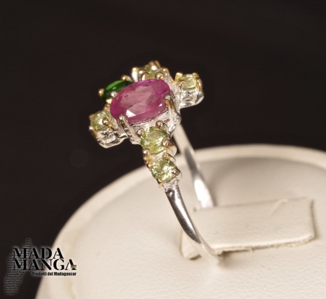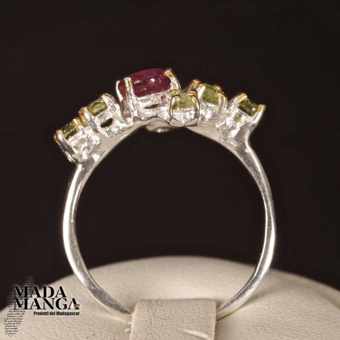 Anello in Argento 925 con placcature in oro giallo, con rubino da mm.5x7, cromo diopside e piccoli peridoti.