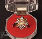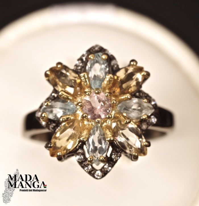 Anello in Argento 925, rodiato con rodio nero e con placcature in oro giallo, con Tormalina rosa al centro, citrini da mm.6x3 e topazi, peso anello 4 grammi. Misura americana 8,25, misura italiana 18, diametro interno mm.18,36. Venduto con scatolina regalo. L'anello è realizzato artigianalmente in pezzo unico per modello e misura.