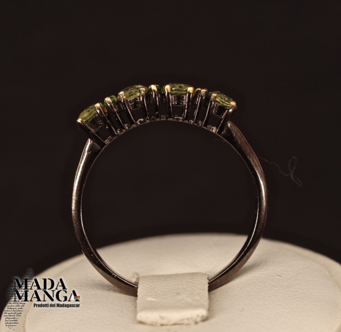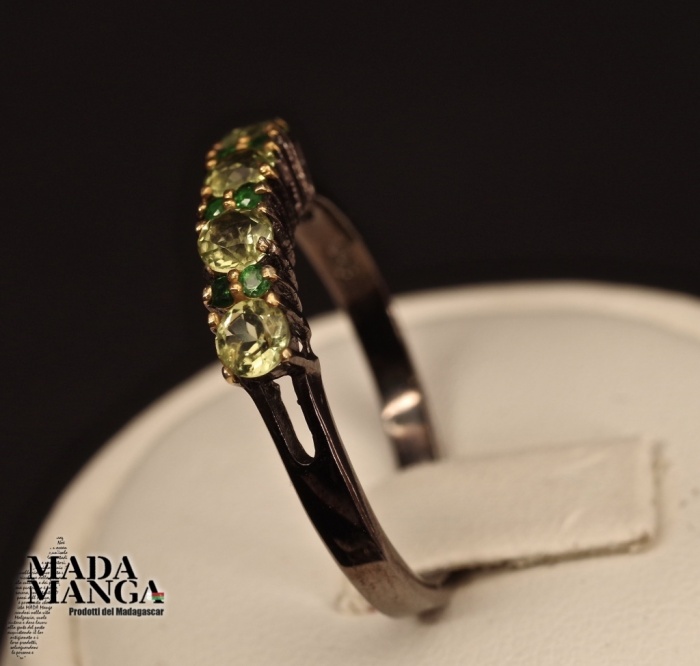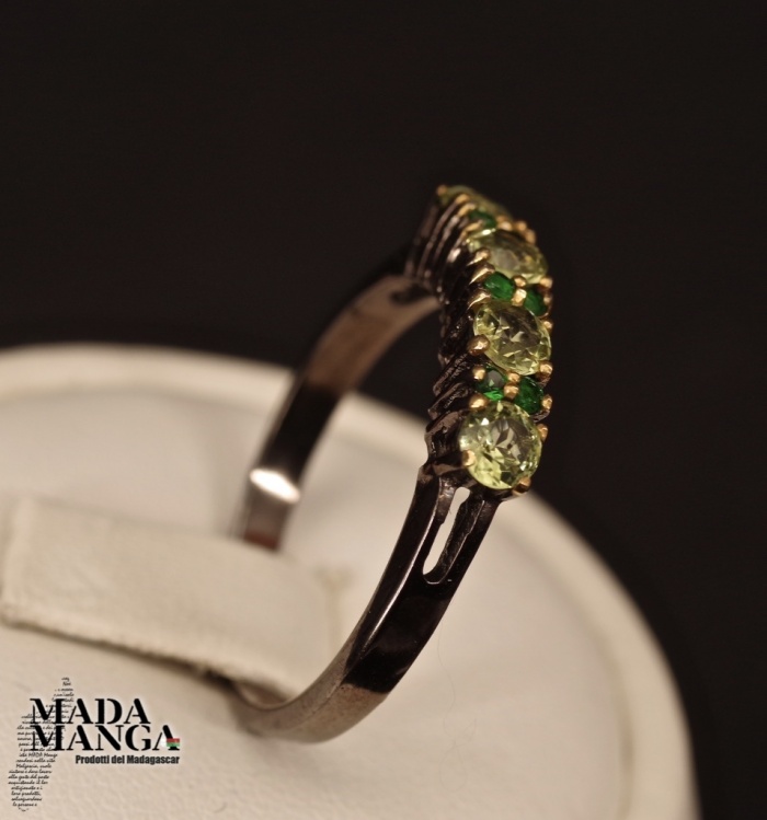 Anello in Argento 925 con placcature in oro giallo, con peridoti da mm.3x3 e cromo diopsidi, peso 2,1 grammi.