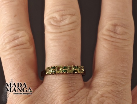 Anello in Argento 925 con placcature in oro giallo, con peridoti da mm.3x3 e cromo diopsidi, peso 2,1 grammi. Misura americana 8,75, misura italiana 19, diametro interno mm.18,71. Venduto con scatolina regalo. L'anello è realizzato artigianalmente in pezzo unico per modello e misura.