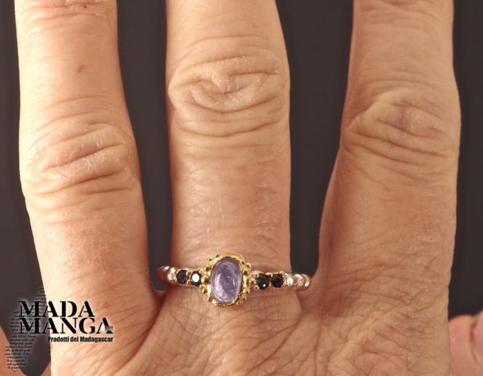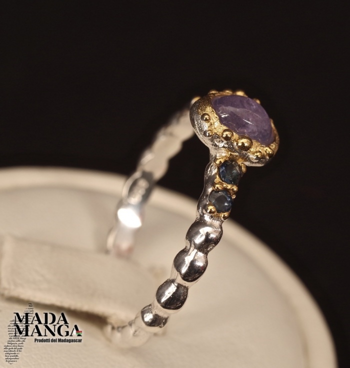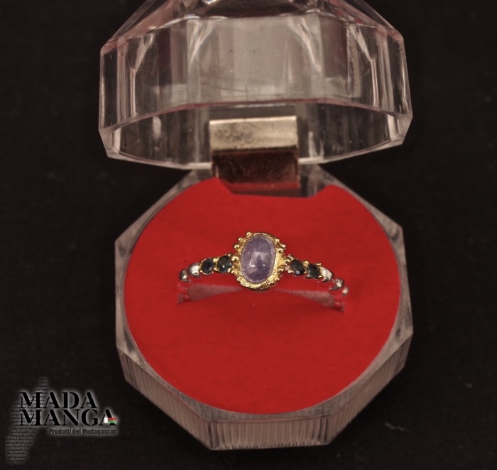 Anello in Argento 925 con placcature in oro giallo, con Tanzanite da mm.6x4 e piccoli zaffiri. Misura americana 9, misura italiana 19, diametro interno mm.18,89. peso anello 2,9 grammi. Venduto con scatolina regalo. L'anello è realizzato artigianalmente in pezzo unico per modello e misura.