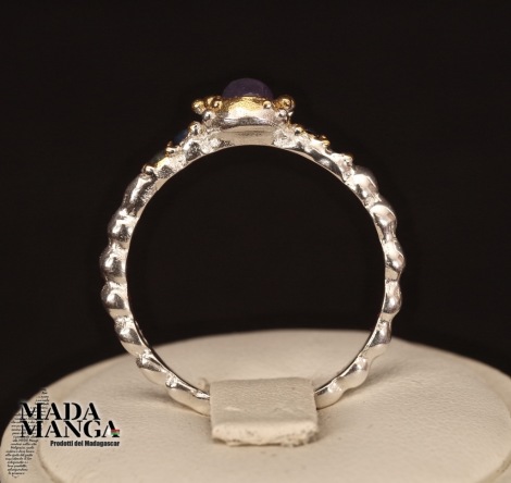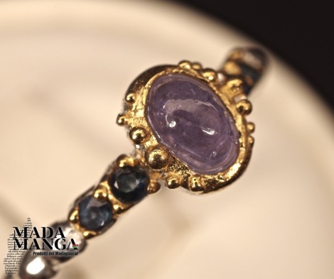 Anello in Argento 925 con placcature in oro giallo, con Tanzanite da mm.6x4 e piccoli zaffiri.