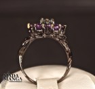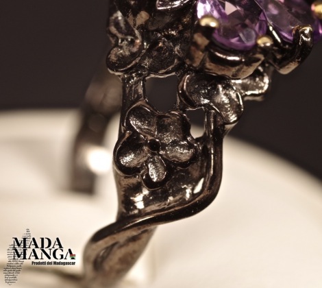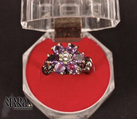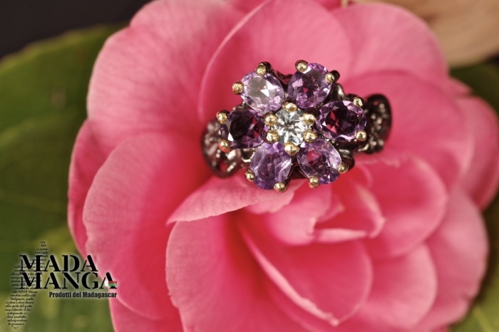 Anello in Argento 925 rodiato con rodio nero e con placcature in oro giallo, con n°6 ametiste da mm.4x5 e topazio al centro della corolla.