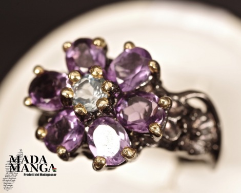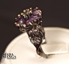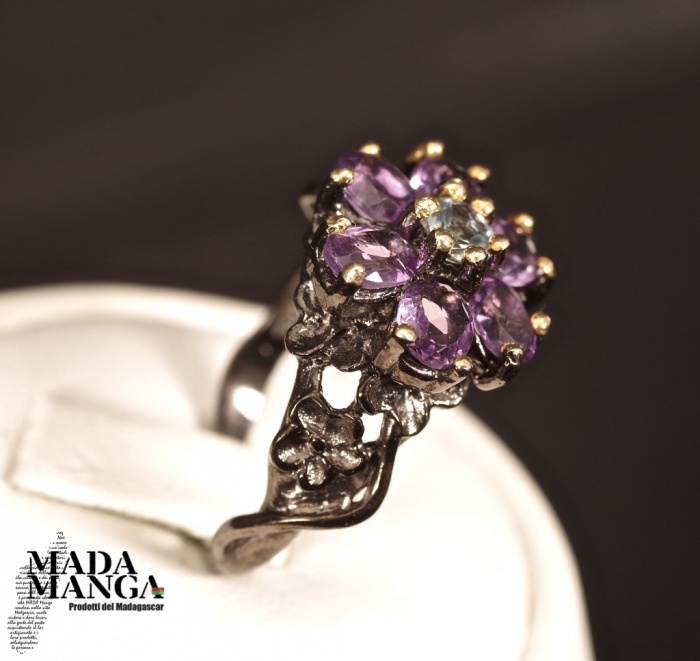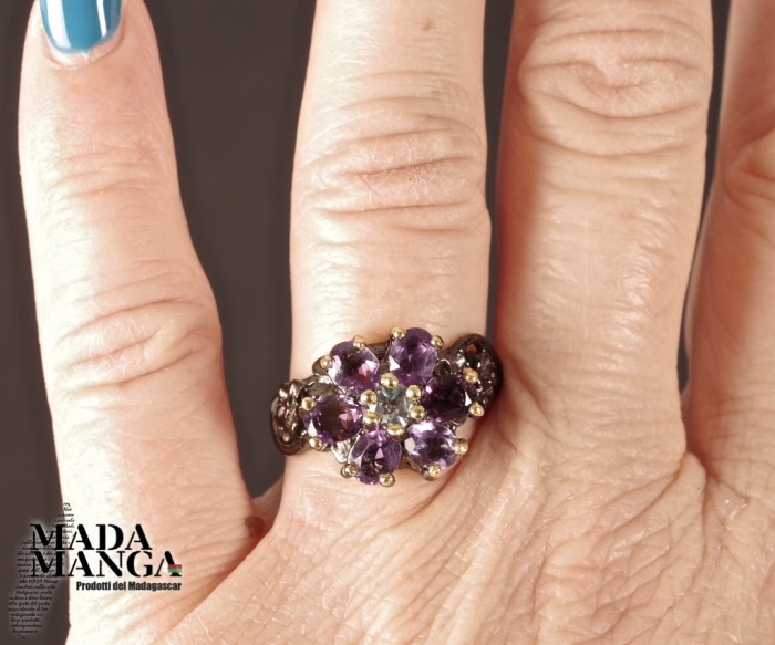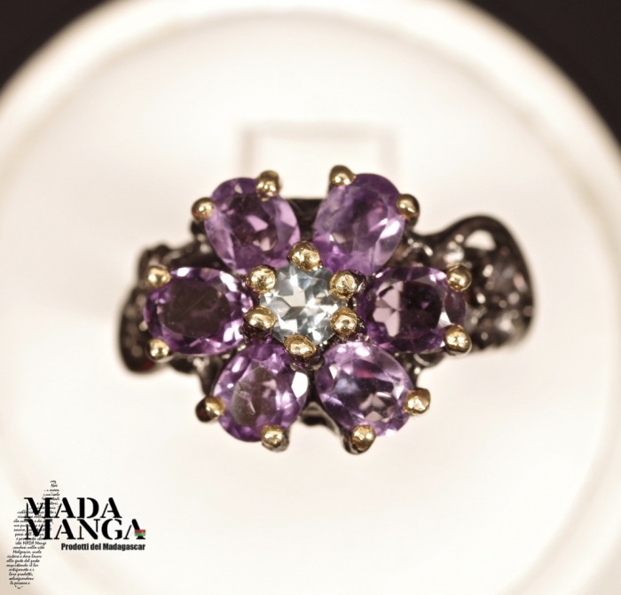 Anello in Argento 925 rodiato con rodio nero e con placcature in oro giallo, con n°6 ametiste da mm.4x5 e topazio al centro della corolla, peso anello 5,3 grammi. Misura americana 7, misura italiana 14,5, diametro interno mm.17,35. Venduto con scatolina regalo. L'anello è realizzato artigianalmente in pezzo unico per modello e misura.