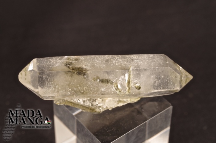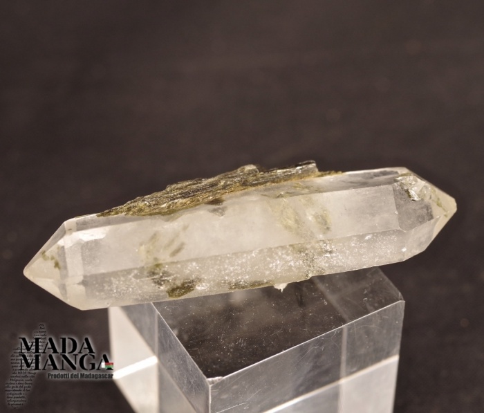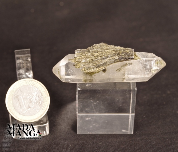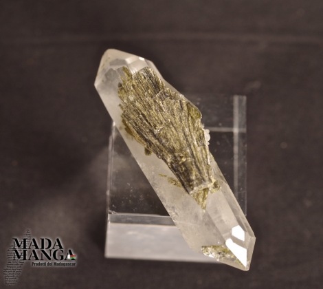 Epidoto raggiato su quarzo ialino biterminato di bellissima trasparenza, dimensioni cm.1,4x1,1x5,8, peso 20,4 grammi. Provenienza Madagascar.