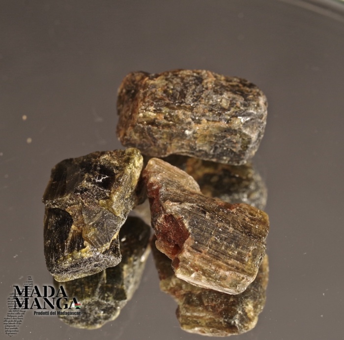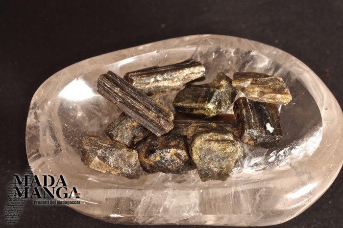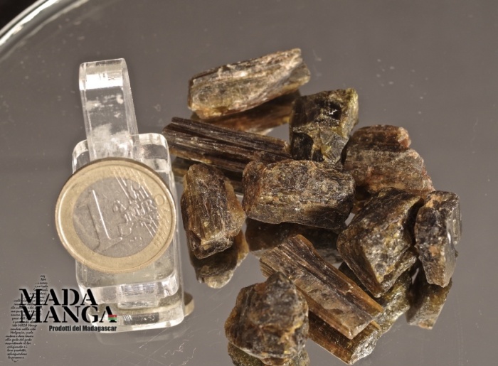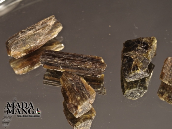 Tormalina verde, dimensioni medie pezzi lung. da cm.1,6 a cm.2,5. Peso medio da 3,2 a 8 grammi.