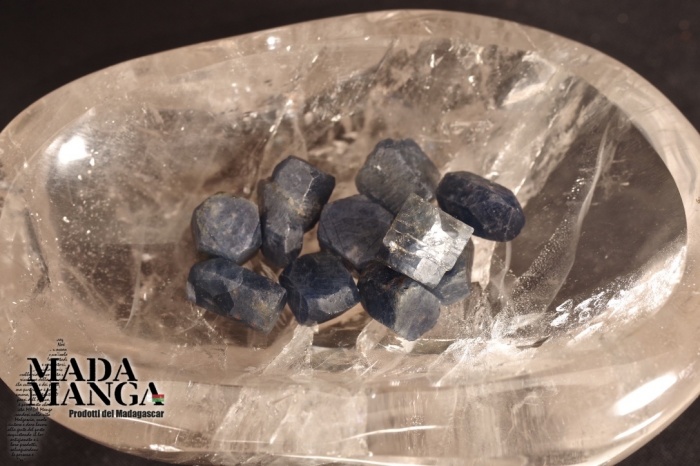 Zaffiro grezzo (corindone blu), dimensioni medie pezzi lung. da cm.0,1 a 0,7. Peso medio 1 grammo.