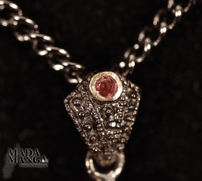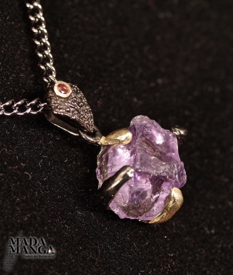 Ciondolo in Argento 925 rodiato con rodio nero con placcature in oro giallo, con ametista grezza e granato sul gancio.