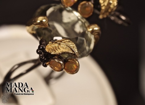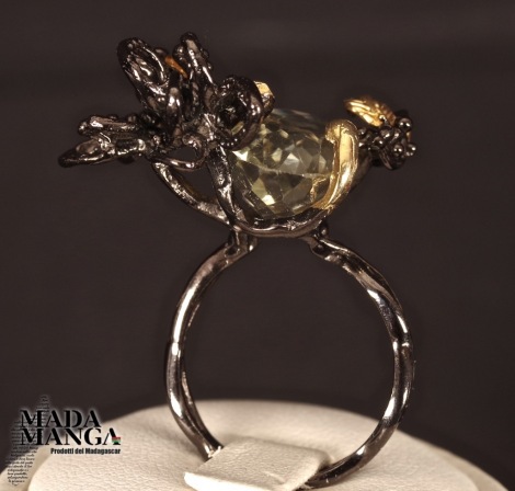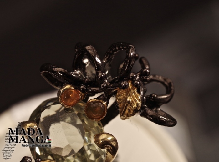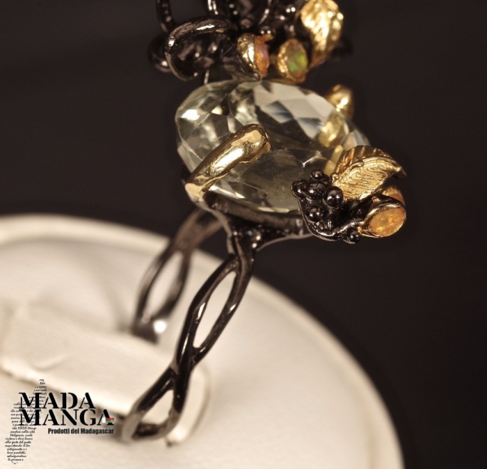 Anello in Argento 925 rodiato con rodio nero e con placcature oro giallo, con Ametista verde (prasiolite) da mm.10x14 e piccoli opali.
