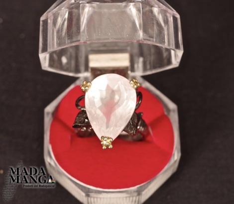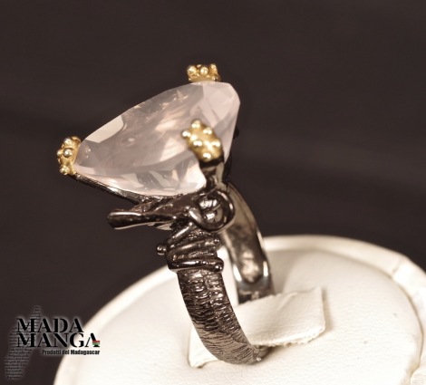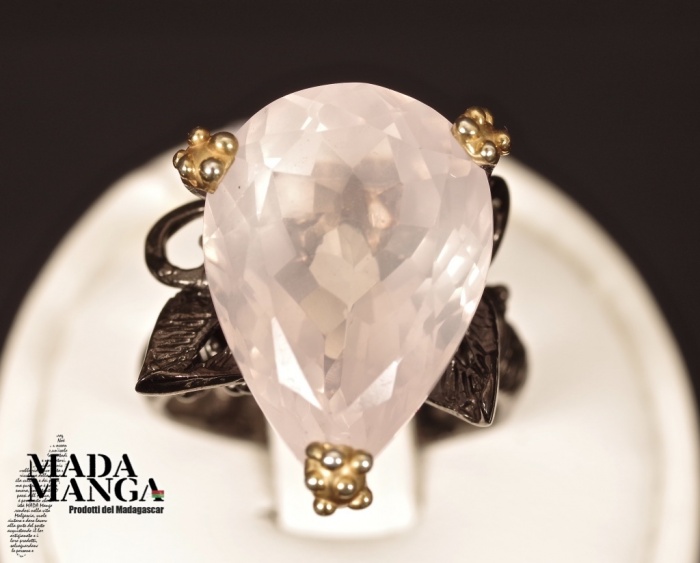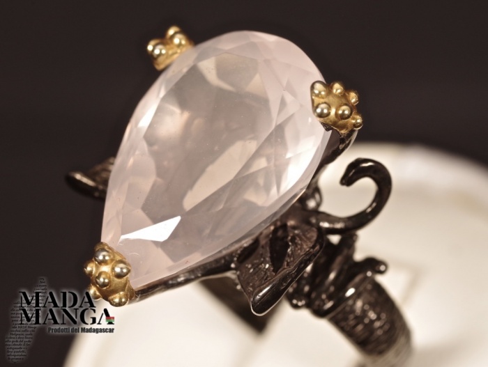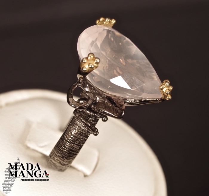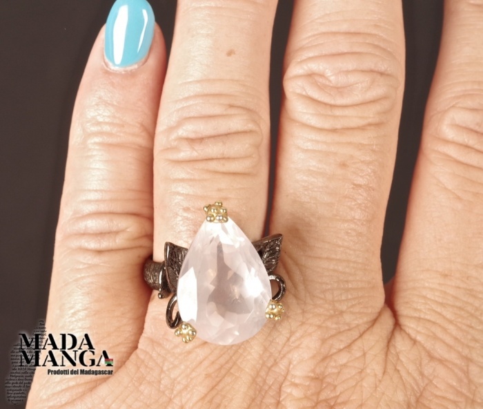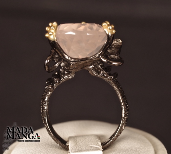 Anello in Argento 925, rodiato con rodio nero con placcature in oro giallo, con Quarzo Rosa da mm.12x13, peso anello 8,8 grammi. Misura americana 7,25, misura italiana 15, diametro interno mm.17,55. Venduto con scatolina regalo. L'anello è realizzato artigianalmente in pezzo unico per modello e misura.
