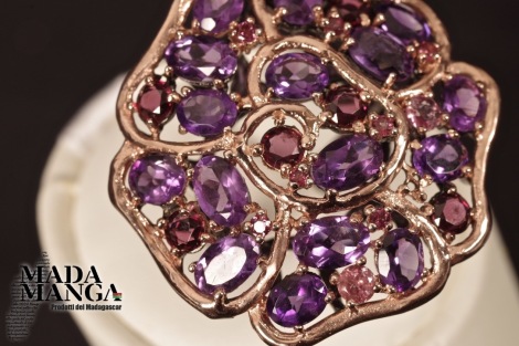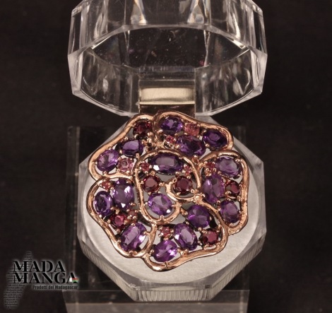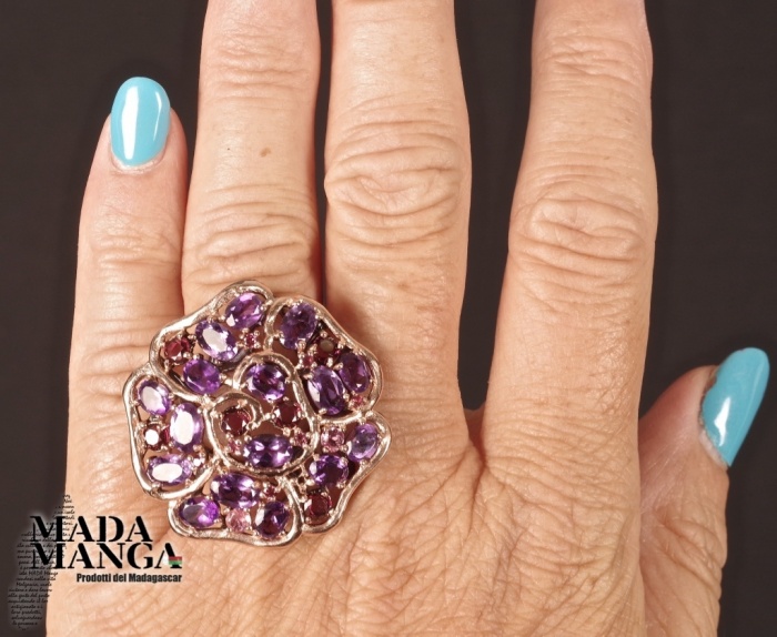 Bellissimo Anello in Argento 925 rodiato con rodio nero e placcato oro rosa, con Ametiste e Tormaline, misura americana 6,5, misura italiana 13, diametro interno mm.16,92. peso anello 10,8 grammi. Venduto con scatolina regalo. L'anello è realizzato artigianalmente in pezzo unico per modello e misura.
