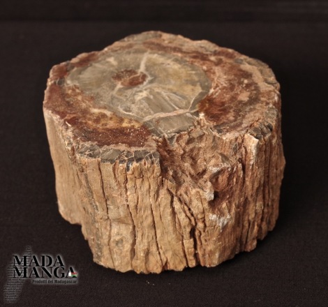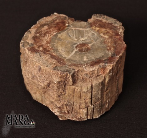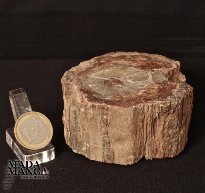 Tronchetto di Legno Fossile del Madagascar, lucidato su una parte e con corteccia esterna, con sfumature di colore grigio e rosso/bruno, dimensioni cm.8x7,1x4,2H, peso 423 grammi.