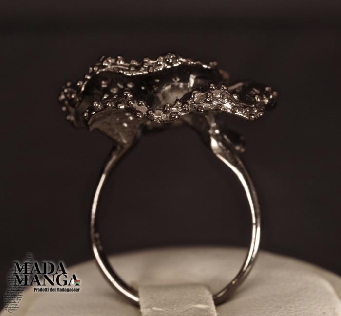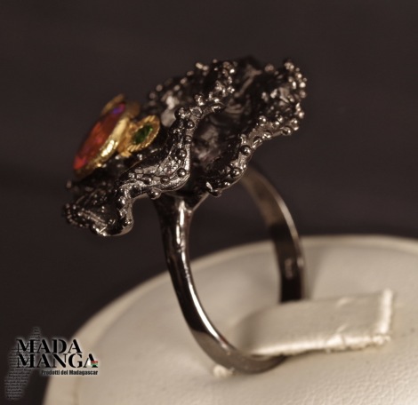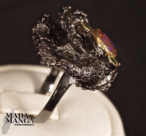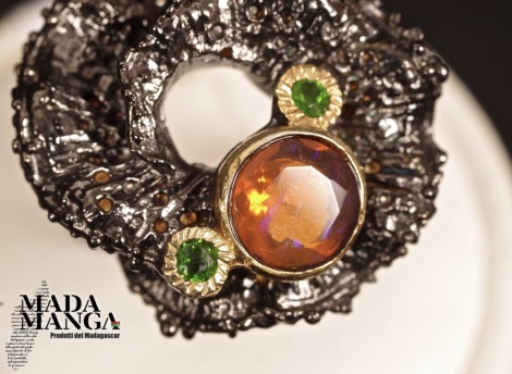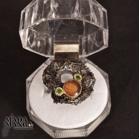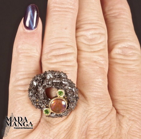 Anello in Argento 925 rodiato con rodio nero e con placcature in oro giallo, con opale arancio da mm.7x7 e cromo diopsidi, peso anello 8,6 grammi. Misura americana 6,5, misura italiana 13, diametro interno mm.16,92. Venduto con scatolina regalo. L'anello è realizzato artigianalmente in pezzo unico per modello e misura.