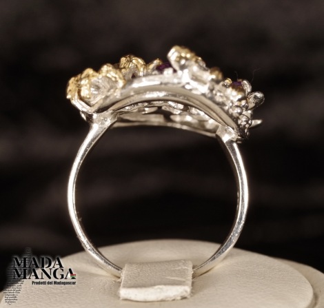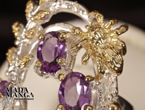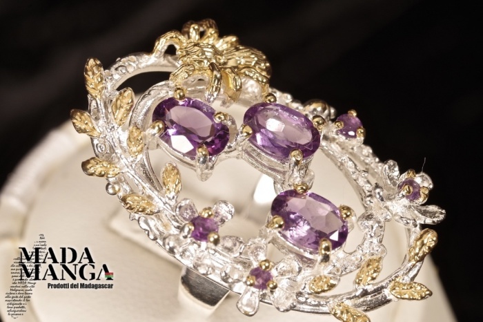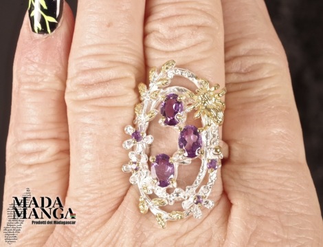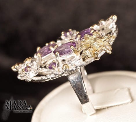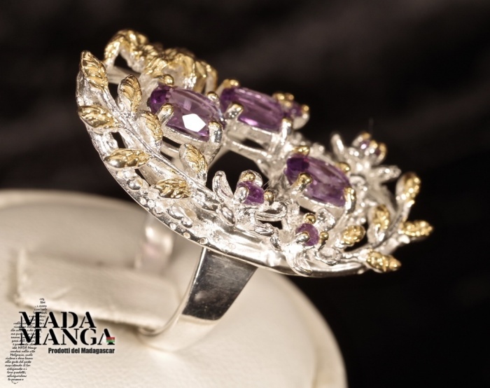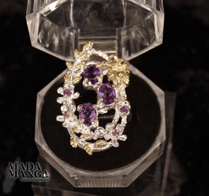 Anello in Argento 925 con placcature in oro giallo, con Ametiste da mm.5x7 e ametiste più piccole, peso anello 10,2 grammi. Misura americana 8, misura italiana 17, diametro interno mm.18,19. Venduto con scatolina regalo. L'anello è realizzato artigianalmente in pezzo unico per modello e misura.