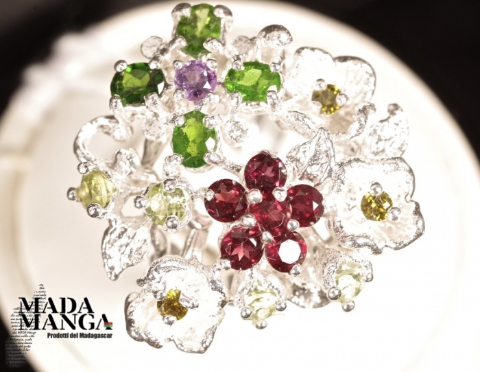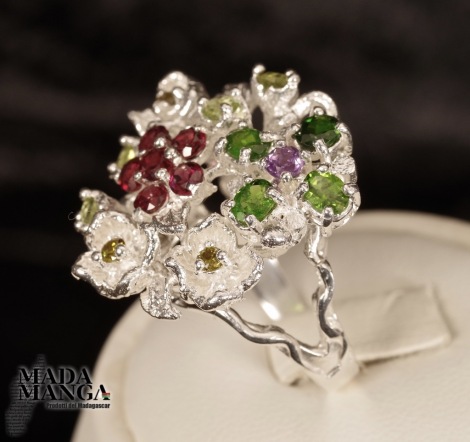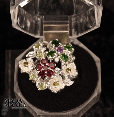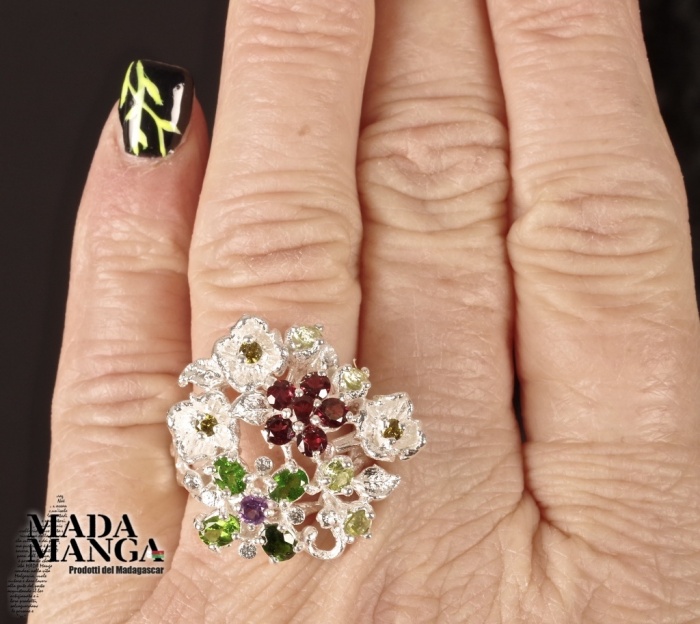 Floreale Anello in Argento 925 con granati, cromo diopsidi, peridoti e ametista.