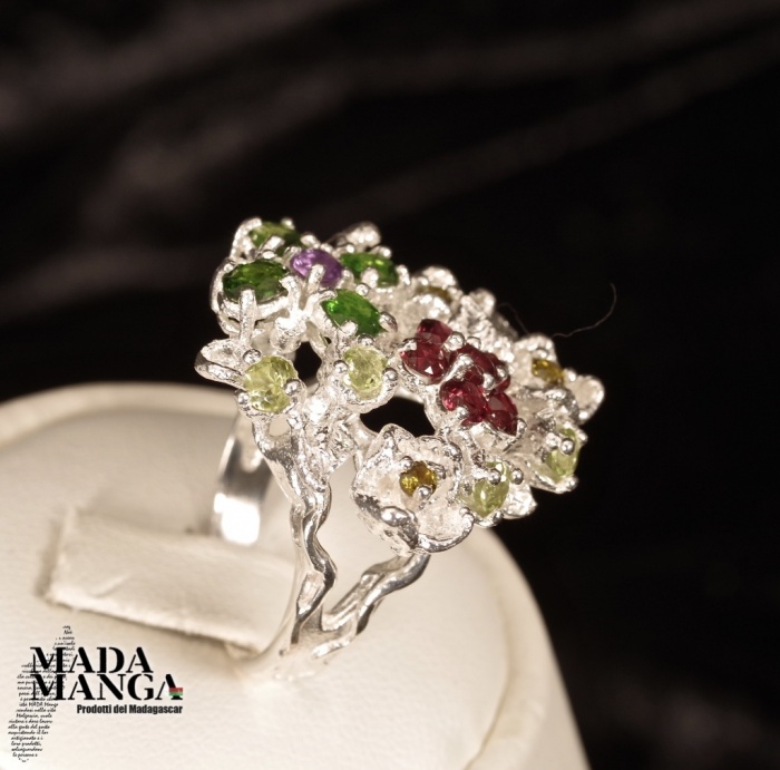 Anello in Argento con granati, cromo diopsidi, peridoti