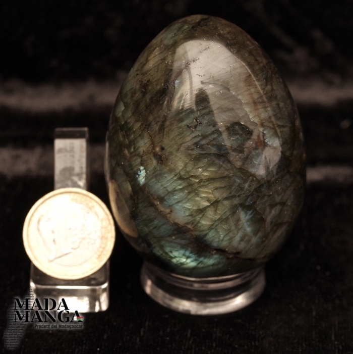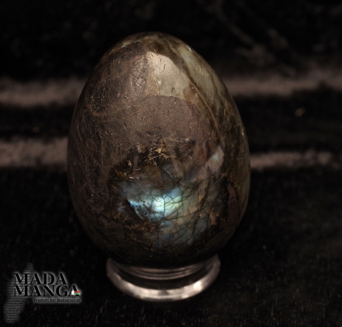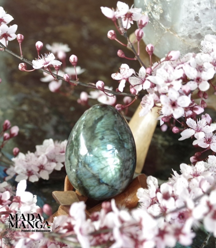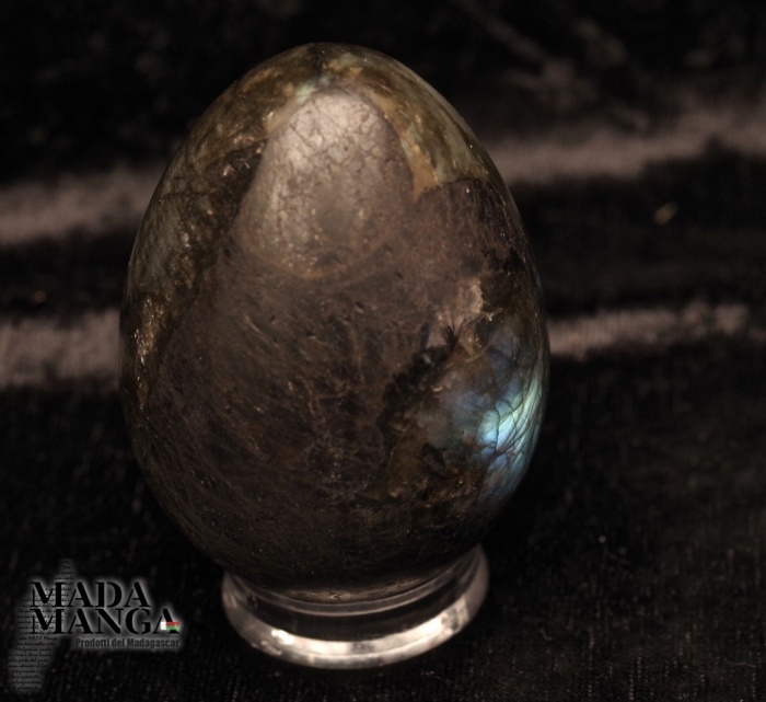 Uovo in Labradorite con riflessi di colore blu e verde, realizzato e lucidato a mano, dimensioni cm.5,1x6,9h. Peso 256 grammi. Provenienza Madagascar.