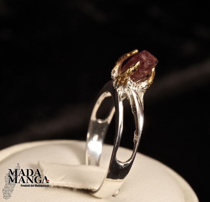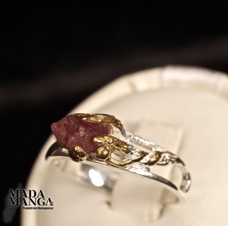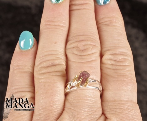 Anello in Argento 925 con placcature in oro giallo, con Tormalina rosa grezza da mm.4x5, peso 3,2 grammi. Misura americana 7,5, misura italiana 16, diametro interno mm.17,75. Venduto con scatolina regalo. L'anello è realizzato artigianalmente in pezzo unico per modello e misura.