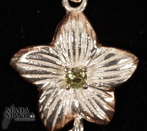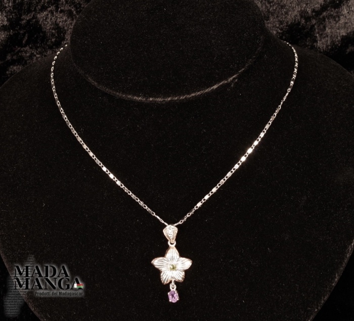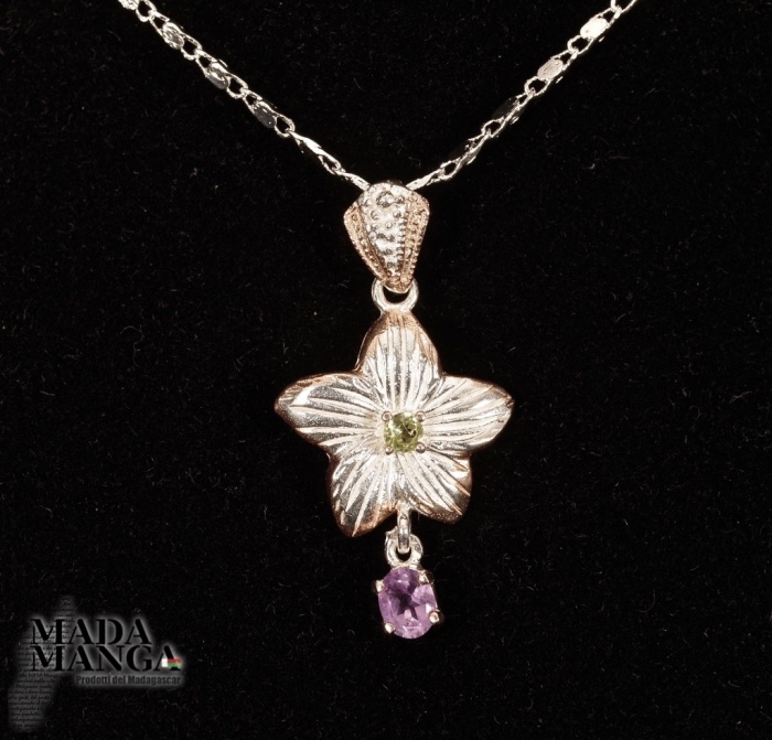 Ciondolo in Argento 925 con placcature in oro rosa con ametista e peridoto al centro del fiore, dimensioni cm.1,7x3,3H gancio incluso, peso 3,1 grammi. Venduto con scatolina regalo in rafia. Catenina esclusa dal prezzo.