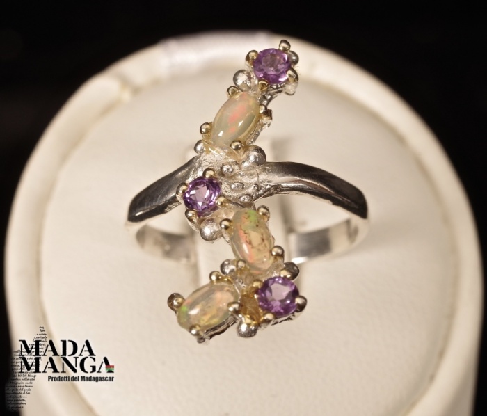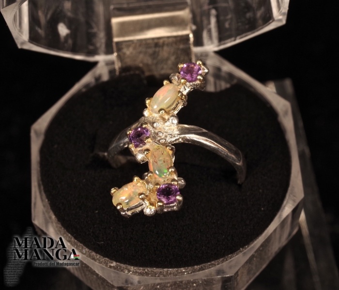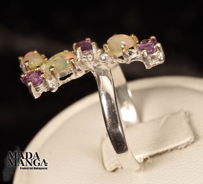 Anello in Argento 925 con placcature in oro giallo, con tre opali etiopi da mm.3x5 e piccole ametiste. Misura americana 7, misura italiana 15, diametro interno mm.17,35. peso anello 2,8 grammi. Venduto con scatolina regalo. L'anello è realizzato artigianalmente in pezzo unico per modello e misura.