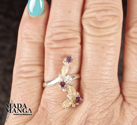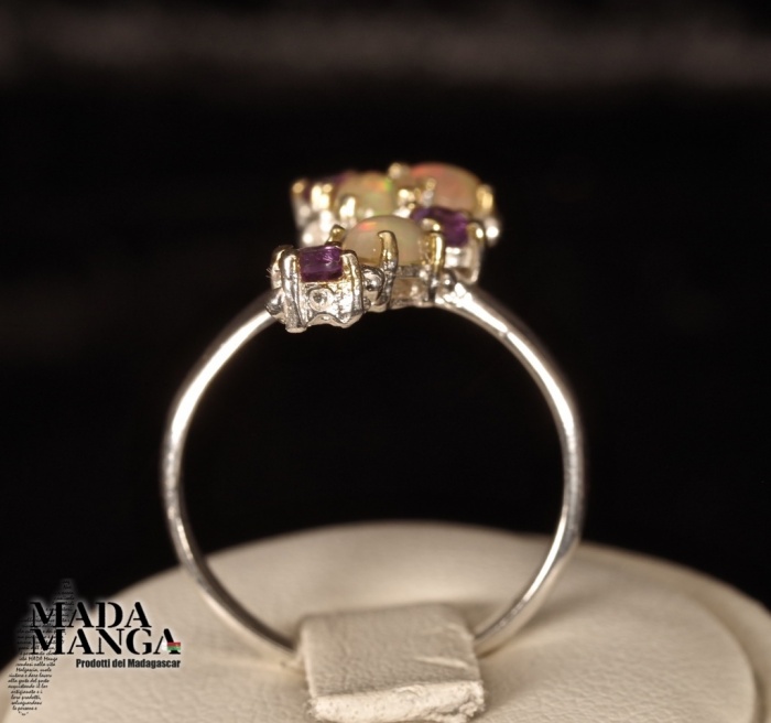 Anello in Argento 925 con placcature in oro giallo, con tre opali etiopi da mm.3x5 e piccole ametiste.