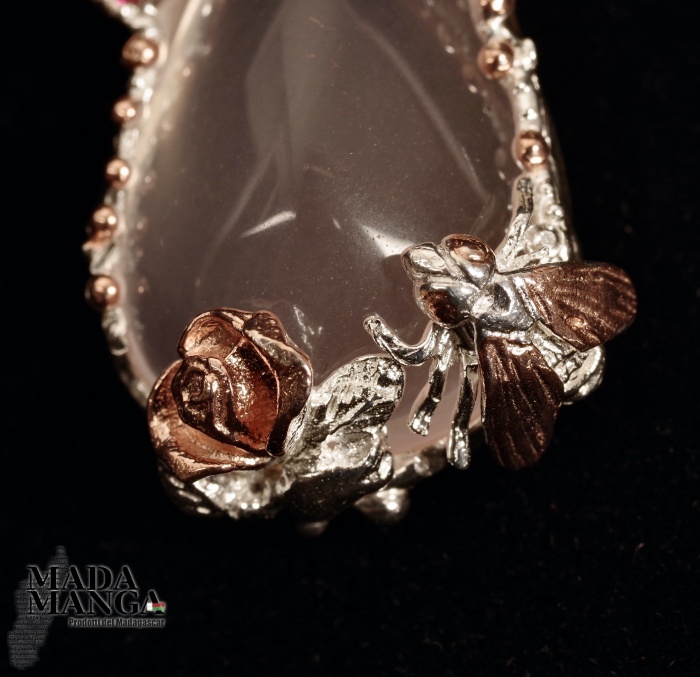 Collana in Argento 925 con placcature in oro rosa, con bel quarzo rosa a goccia, due peridoti e piccole rodoliti. Dimensione pendente cm.3,5x4,1. Lunghezza collana cm.46. Peso 19,3 grammi. Venduta con scatola regalo.