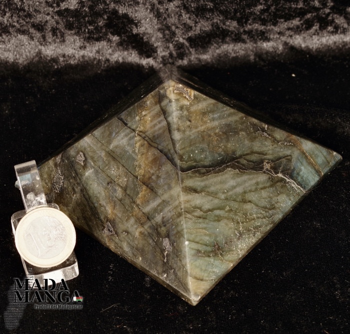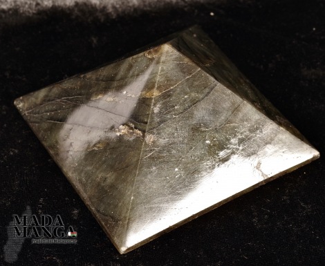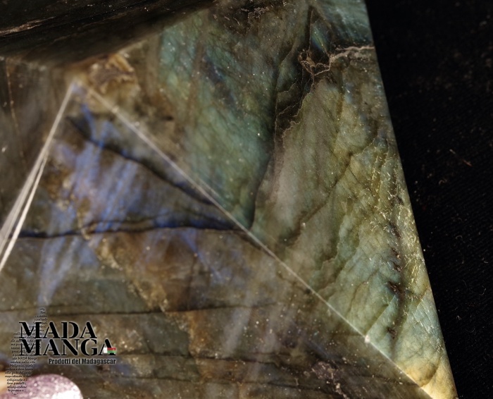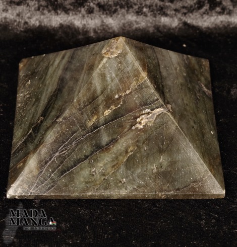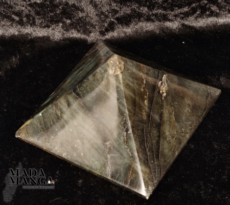 Piramide in Labradorite, provenienza Madagascar, realizzata e lucidata a mano, dimensioni cm.9,5x9,5x5,6H. Peso 496 grammi.