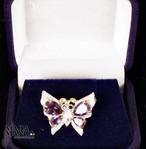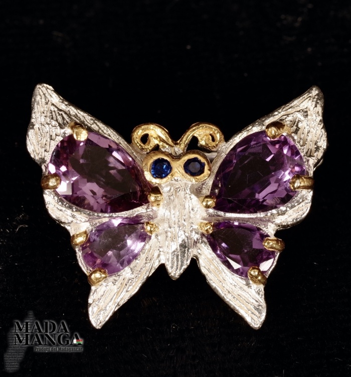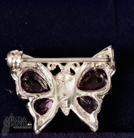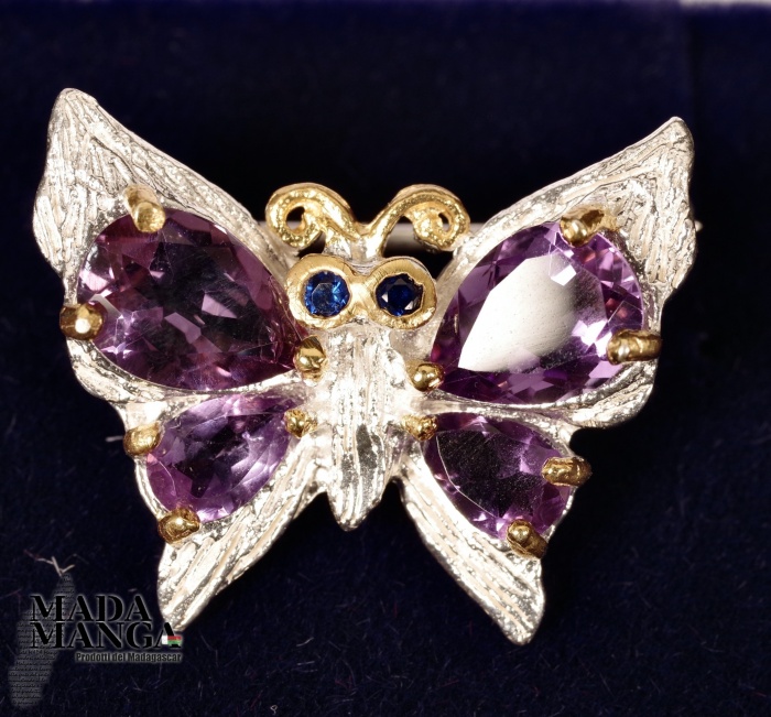 Spilla in argento 925 a forma di farfalle con placcature in oro giallo, con ametiste sulle ali e zirconi per gli occhi.