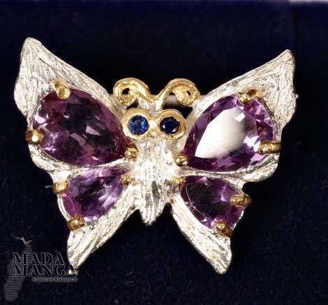 Spilla in argento 925 a forma di farfalle con placcature in oro giallo, con ametiste sulle ali e zirconi per gli occhi. dimensioni cm.2,3x1,9, peso 4,3 grammi. Venduta con scatolina regalo.