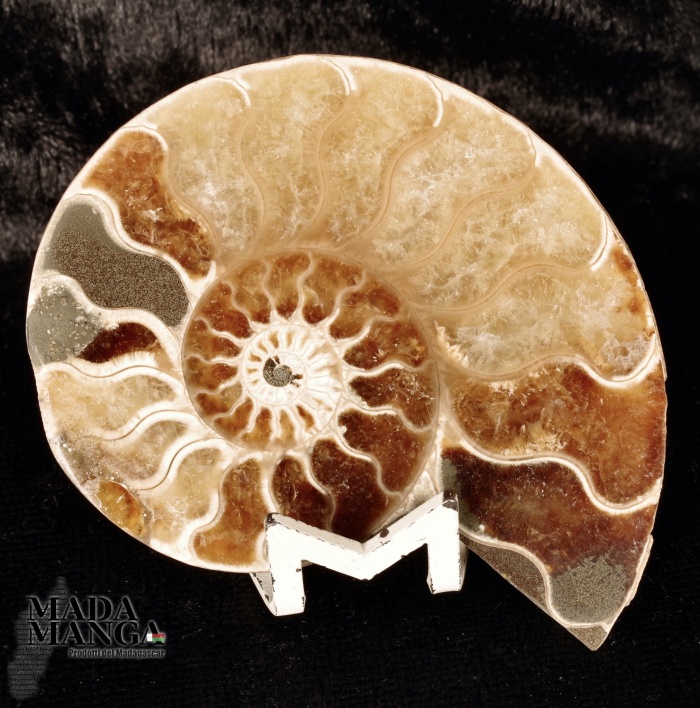 Ammonite tagliata e lucidata, perfetta definizione dei setti di crescita con cristalli di calcite, conservazione perfetta del guscio esterno, dimensione cm.6,1x4,4x1,6 spessore peso 52,4 grammi. Provenienza Madagascar